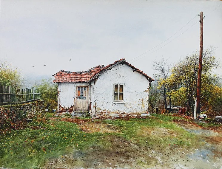 "As I was walking in a village, I suddenly saw this tiny, white house. It was a beautiful autumn day, so calm, peaceful, and full of silence, like just before a rain starts. I was inspired by this scene and decided to come back and paint it in exactly that mood and atmosphere.