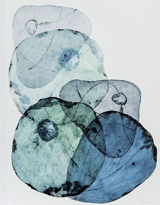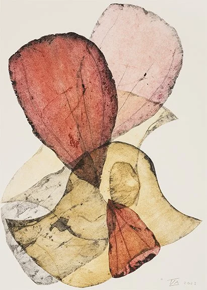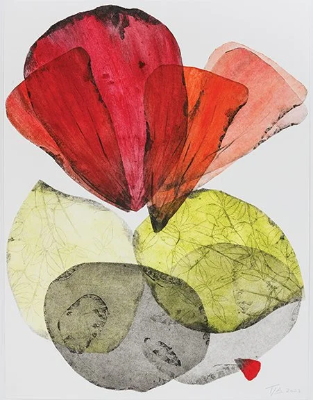 For her prints, Labossière has developed a technique using cardboard that she cuts and carves to create volume and shape in her compositions. She uses a palette of beautiful colors in her work to print forms that are delicate and transparent with an ethereal quality; artwork that is far beyond a traditional rendering of natural forms.