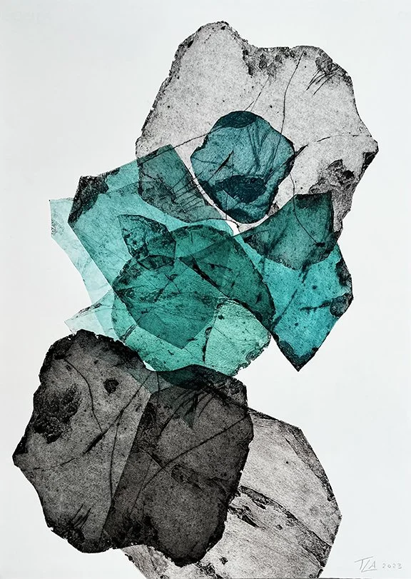 "I try to translate the soul of nature in my work," she explains. "My monoprints are a play of shape and volume that are reminiscent of stones or natural materials like leaves that express a vital energy. By superimposing them, I try to reveal delicate transparencies that contrast with the energy of the materials."